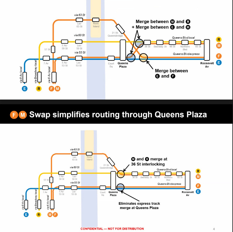 The proposed swap eliminates some of this ripple effect. With the swap in place, a delay on the R train would affect only the M train, leaving QBL express service, which has higher ridership, unaffected. Meanwhile, delays on the E or F trains have no effect on the M and R trains, improving reliability across the entire system.